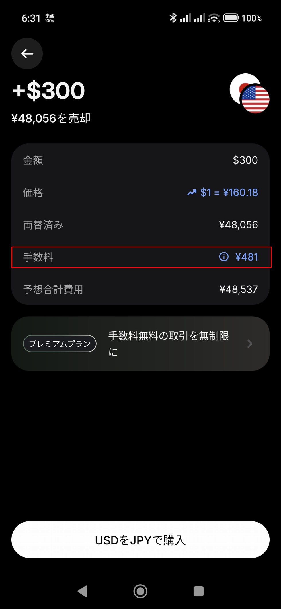 Revolutの方は、スクリーンショットにあるように、”予想合計費用”となっています。例えば、ドルへの両替の場合は、48,059円と表示されていますが、実際には、48,060円(差額1円)が日本円から減額していました。僅かですけどね。一応、記録として残しておきます。